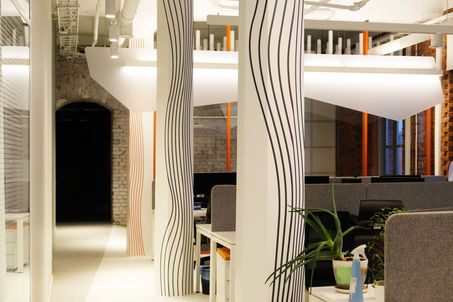 After a thorough analysis of the space and its functional requirements, an approach was chosen that allowed transforming the columns' external form with a specially developed design for the print layer. This design became a kind of visual wrap, not only correcting the perception of their curvature but also giving the entire space a new, refined character.